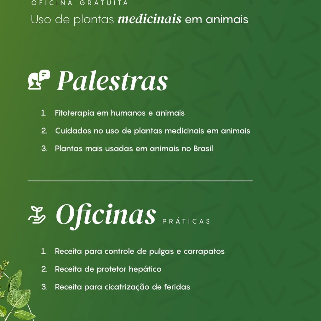 Então participe da oficina “Uso de Plantas Medicinais em Animais”! No dia 21 de fevereiro, você pode aprender sobre fitoterapia, cuidados no uso de plantas medicinais e receitas práticas para tratar pulgas, carrapatos, feridas e até proteger o fígado dos bichinhos. Tudo de forma natural e segura.